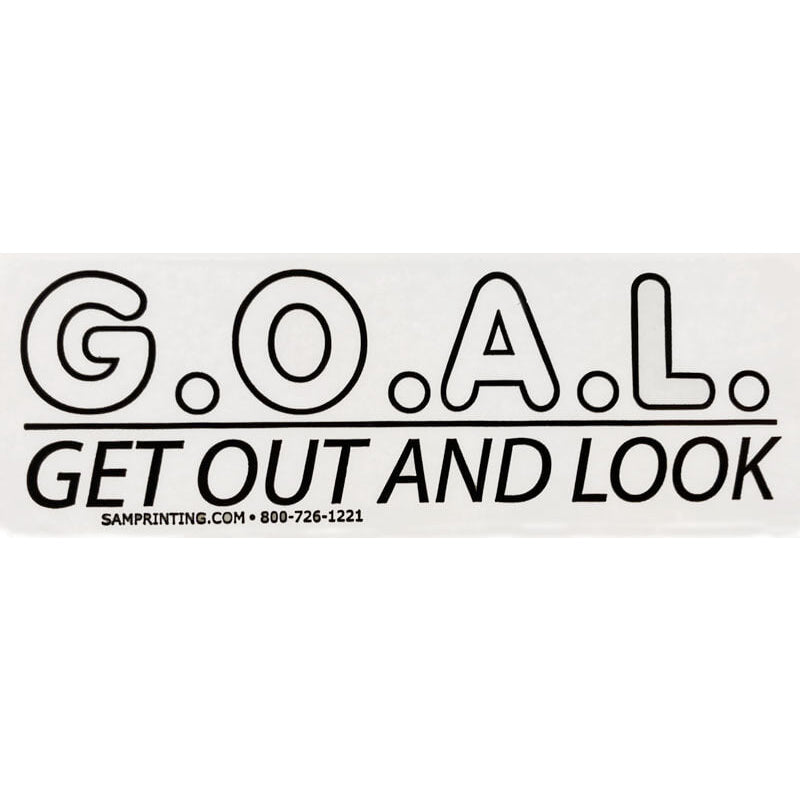 Introducing G.O.A.L.-Get Out And Look exterior side mirror stickers, a safety reminder to check your vehicle before and after driving. These 1.5" by 4" decals feature black ink on clear permanent adhesive vinyl with lamination for weather protection. Made in the USA. Stay safe on the road with G.O.A.L. Stickers. #DrivingSafety#safedriving#safedrivingtips#SafeDriveSaveLife#safedriver Pack of 50 = $49 Pack of 200 = $138 Pack of 500 = $225 Pack of 1,000 = $375 Pack of 2,500 = $849 Pack of 5,000 = $1497