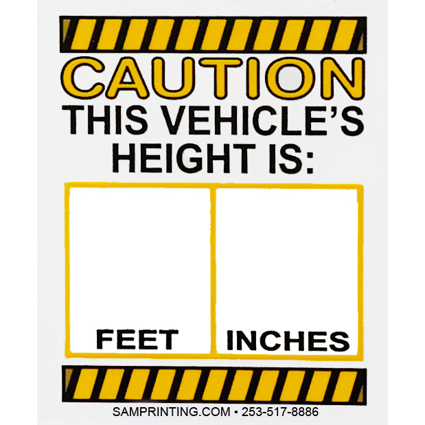 Generic Vehicle Height Window Stickers, avoid costly accidents with your fleet trucks. Sized at 2.5 inches X 2 inches, black and yellow ink, plus 2 white write-on boxes for feet and inches, on clear vinyl. These clear stickers feature a low tack adhesive vinyl that is easy to apply and remove with no residue left behind...will NOT drop off windows like static-stick at temperature extremes. Made in the USA